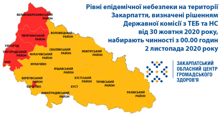 Західну частину Закарпаття віднесено до червоного рівня епідемічної небезпеки, решта – помаранчева 08.11.202030.10.2020
