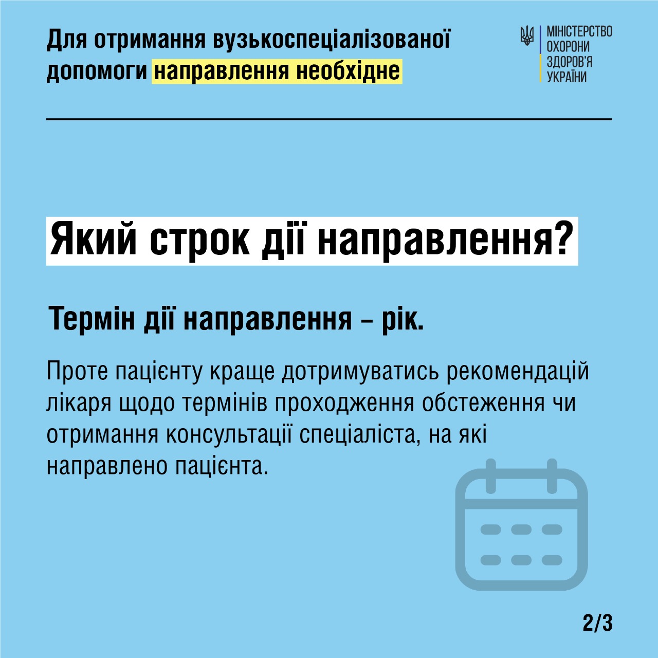 Термін дії направлення – рік. Проте пацієнту краще дотримуватись рекомендацій лікаря щодо термінів проходження обстеження чи отримання консультації спеціаліста, на які направлено пацієнта.