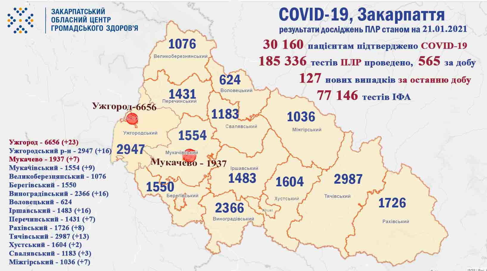 - від початку пандемії 30160 закарпатцям встановлено діагноз COVID-19, із яких 2 318 – медики та 1525- діти ;