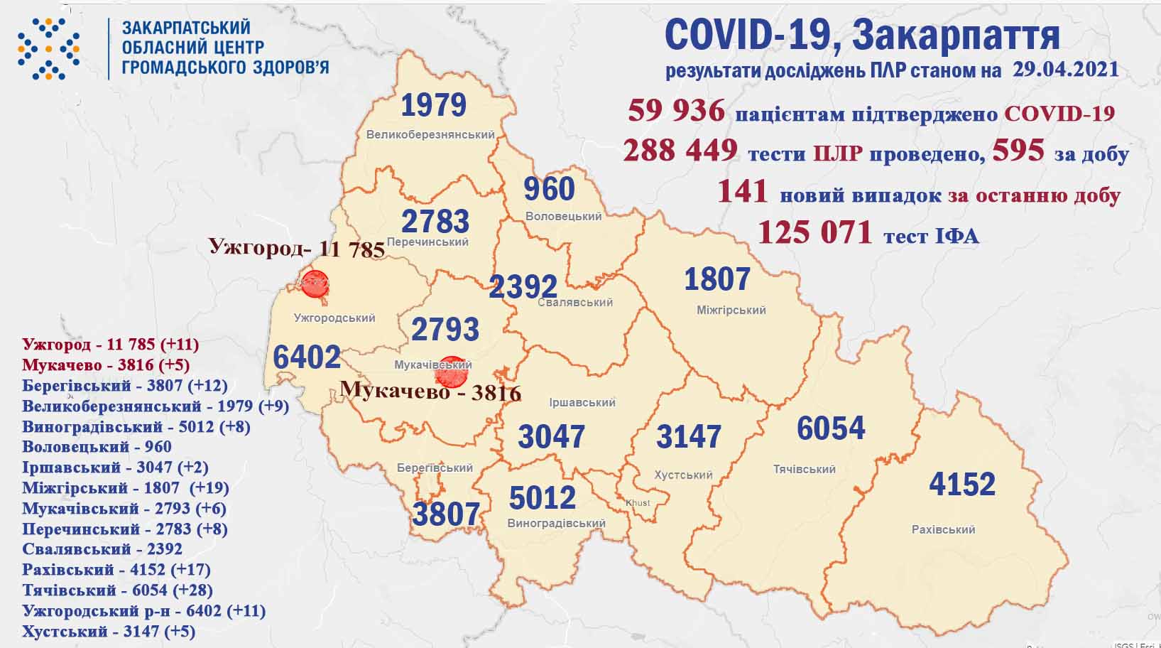 - від початку пандемії 59 936 закарпатцям встановлено діагноз COVID-19, із яких 3522– медики та 2969 – діти ;