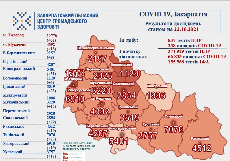 - від початку пандемії 66 833 закарпатцям встановлено діагноз COVID-19, із яких 3710 – медики та 3567 – діти;