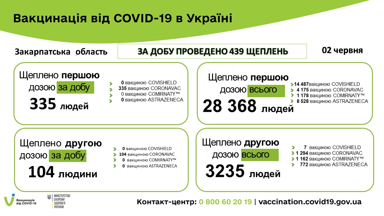 Оперативна інформація по щепленню від COVID -19 за 2 червня 03.06.202102.06.2021 Вакцинація вiд СOVID-19 в Закарпатській області за 2 червня 2021 року: + 439 осіб щеплені за добу, із них – 335 людей щеплені ПЕРШОЮ дозою, а 104 людини – ДРУГОЮ дозою.