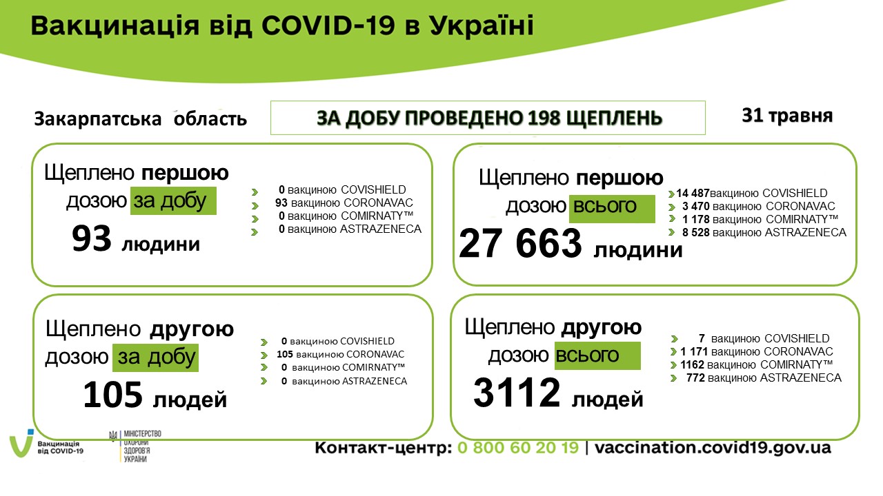 Оперативна інформація по щепленню від COVID-19 за 31.05 01.06.2021 Вакцинація вiд СOVID-19 в Закарпатській області за 31 травня 2021 року: + 198 осіб щеплені за добу, із них – 93 людей щеплені ПЕРШОЮ дозою, а 105 людей – щеплені ДРУГОЮ дозою