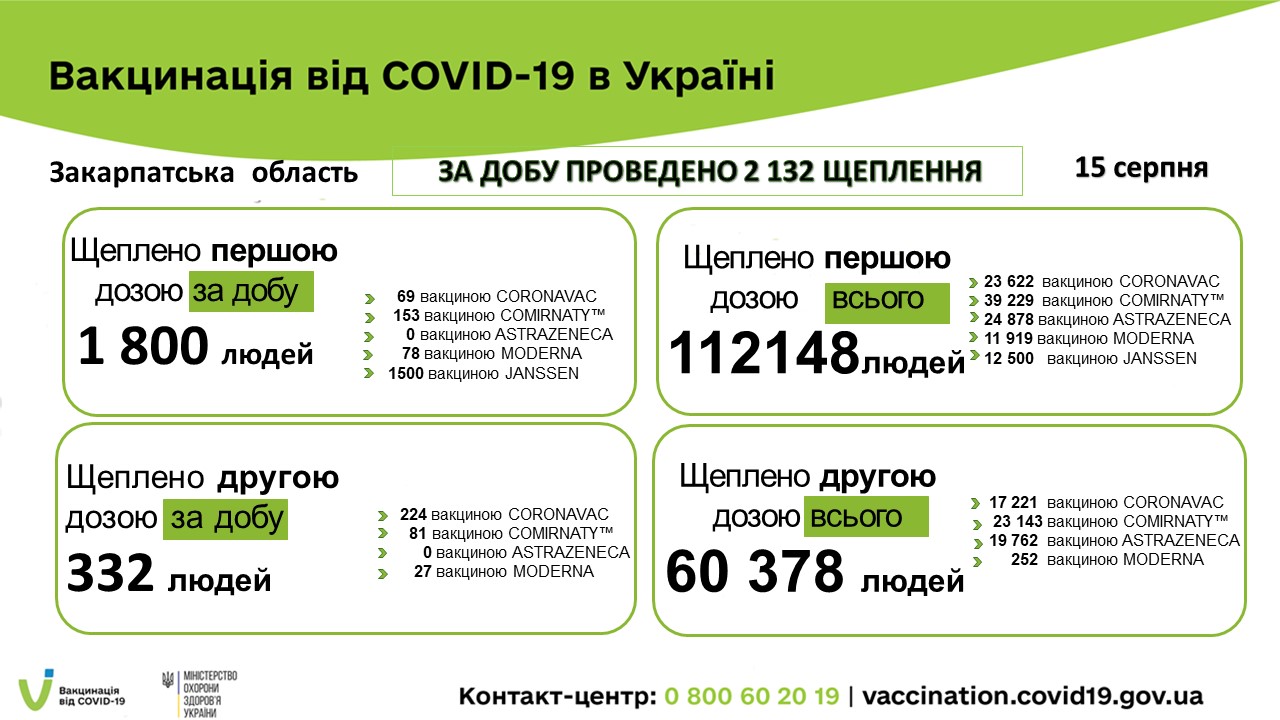 Оперативна інформація з вакцинації за 15 серпня 16.08.2021 Вакцинація вiд СOVID-19 в Закарпатській області за 15 серпня 2021 року: +2 132 осіб щеплені за добу, із них – 1800 людей щеплені ПЕРШОЮ дозою, а 332 людей – ДРУГОЮ дозою. За інф. https://covid19.rnbo.gov.ua/