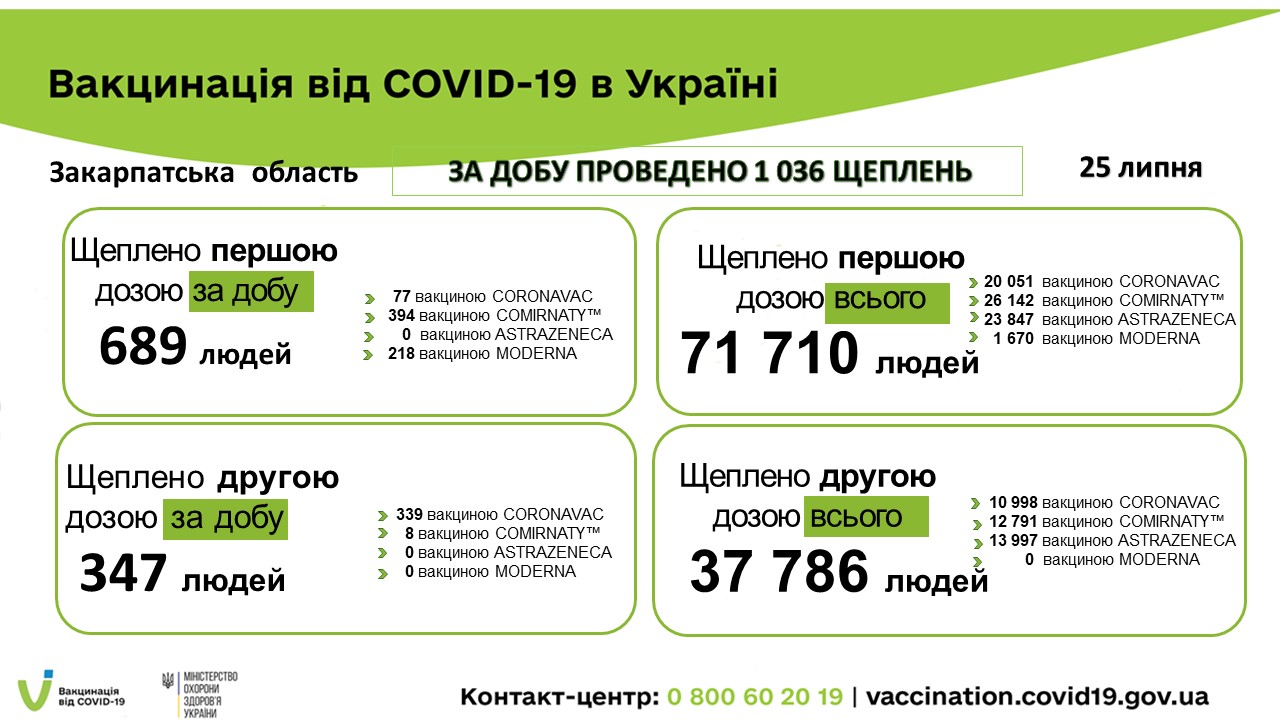 Вакцинація вiд СOVID-19 в Закарпатській області за 25 липня 2021 року 26.07.2021 +1 036 осіб щеплені за добу, із них – 689 людей щеплені ПЕРШОЮ дозою, а 347 людей – ДРУГОЮ дозою.